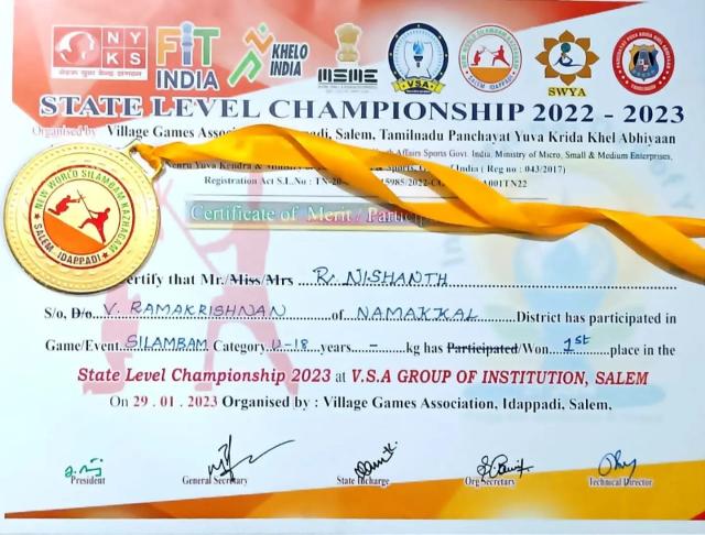 Congratulations to our student Nishanth.R. for securing FIRST PLACE in Silambam at the State level competition in the above 18 years category organized by Tamil Nadu Lathi Association at VSA group of institutions among around 70 participants. He also graduated as National level judge in Silambam.