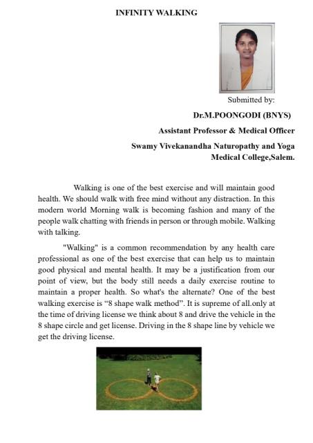 Article about INFINITY WALKING by Dr.M.Poongodi, Assistant Professor cum Medical Officer, Swamy Vivekanandha Naturopathy and Yoga Medical College , Sankari, Salem(dt)