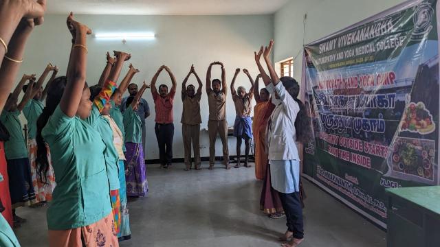 Day 2 Free Naturopathy and Yoga Medical Camp conducted by Swamy Vivekanandha Naturopathy and Yoga Medical College and Hospital Sankari,Salem at Sanga velli vizha kattidam, Sankari on 5.3.23.Around 50 beneficiaries took Free Consultations,Diet Counseling Yoga therapy, Acupuncture and other Naturopathy treatments
