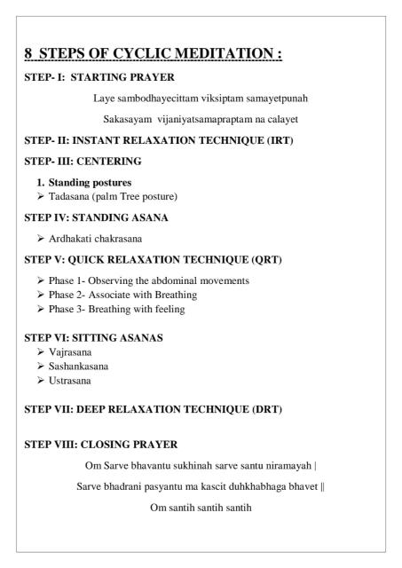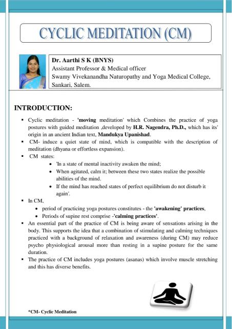 Article about Cyclic Meditation by Dr.Aarthi BNYS, Assistant Professor cum Medical Officer, Swamy Vivekanandha Naturopathy and Yoga Medical College, Sangakiri, Salem(dt)