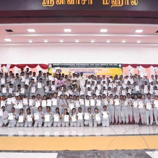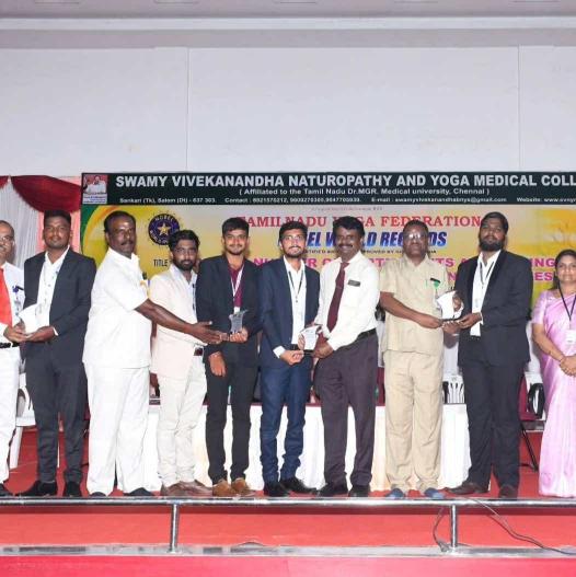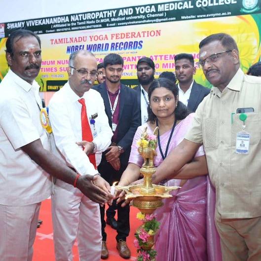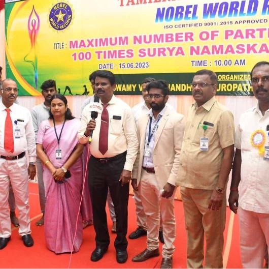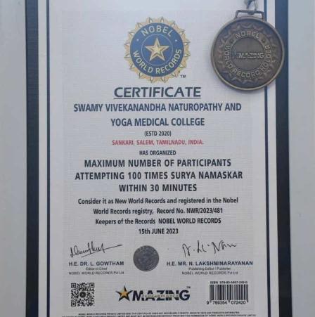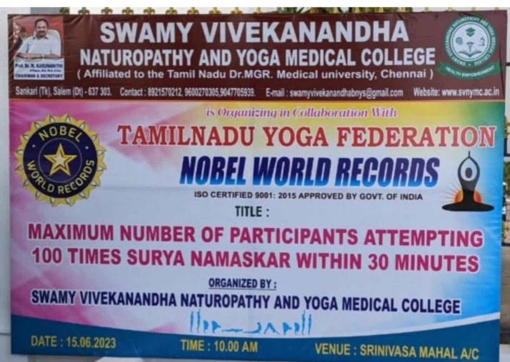 Swamy Vivekanandha Naturopathy and Yoga Medical College, Salem has set a NEW WORLD RECORD of Maximum number of participants attempting 100 times SURYA NAMASKAR Within 30 minutes on 15th June 2023 .