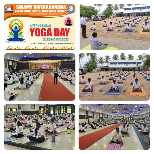 Swamy Vivekanandha Naturopathy & Yoga Medical College, Sankagiri, Salem celebrated International Yoga day 2023 by conducting Mass Yoga Protocol practice session for the students and Faculties of Swamy Vivekanandha Medical college Hospital & Research Institute, Elayampalayam, Tiruchengode