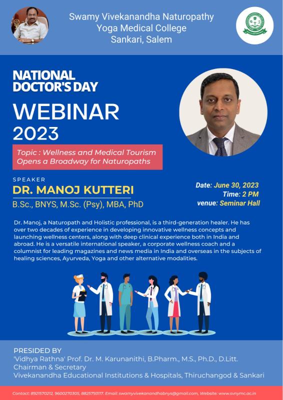 An informative Webinar on "Opportunities in Wellness and Travel Tourism sector" by Dr.Manoj Kutteri ,CEO and Wellness Director,Atmantan Wellness Centre ,Pune,Maharashtra, for the students of Swamy Vivekanandha Naturopathy and Yoga Medical College Salem, Tamil Nadu