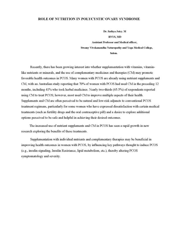 Article about Roles of Nutrition in polycystic Ovary Syndrome by Dr. Sathyajoicy BNYS., MD Assistant Professor cum Medical Officer, Swamy Vivekanandha Naturopathy and yoga Medical College, Sankari, salem Dt.