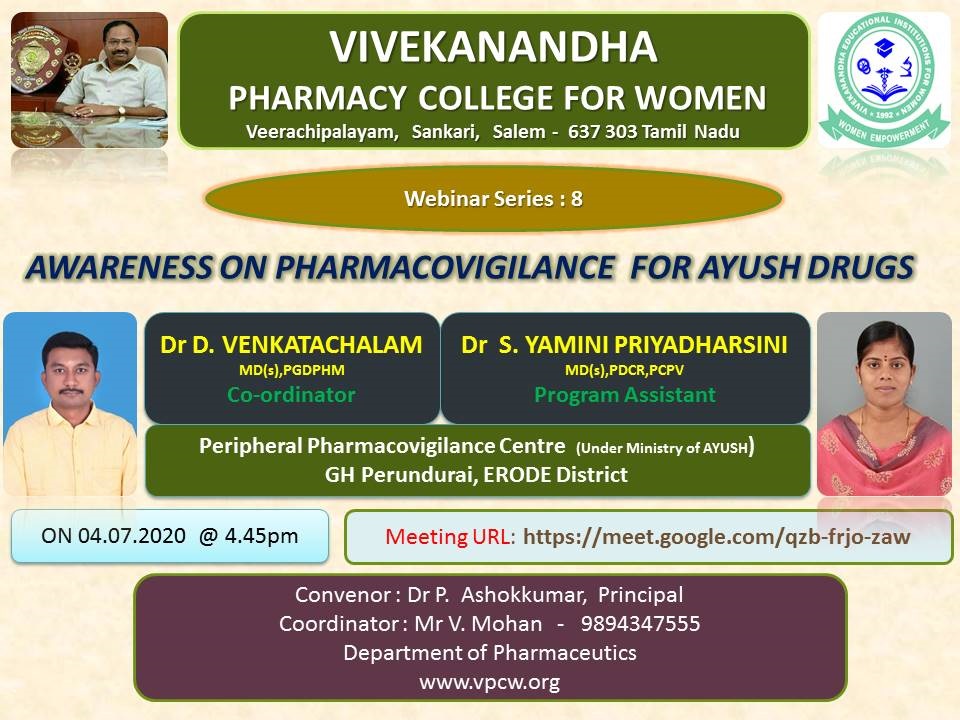 | 6 | Awareness on pharmacovigilance for Ayush drugs | 04/07/2020 | Dr.D.VENKATACHALAM MD(s), PGDPHM Dr.S.YAMINI PRIYADHARSINI MD(s), PDCR, PCPV |