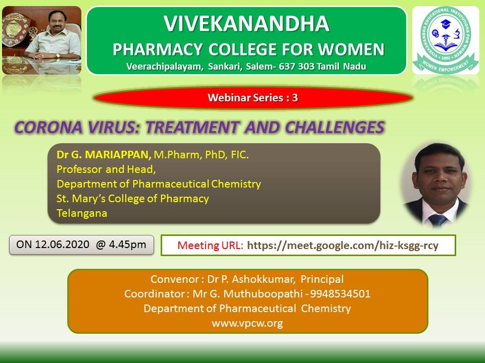 | 3 | Corona virus: treatment and challenges | 12/06/2020 | Dr G. MARIAPPAN, Mpharm, Ph.D, FIC. Professor and Head Department of pharmaceutical chemistry St. Mary’s college of pharmacy Telangana |