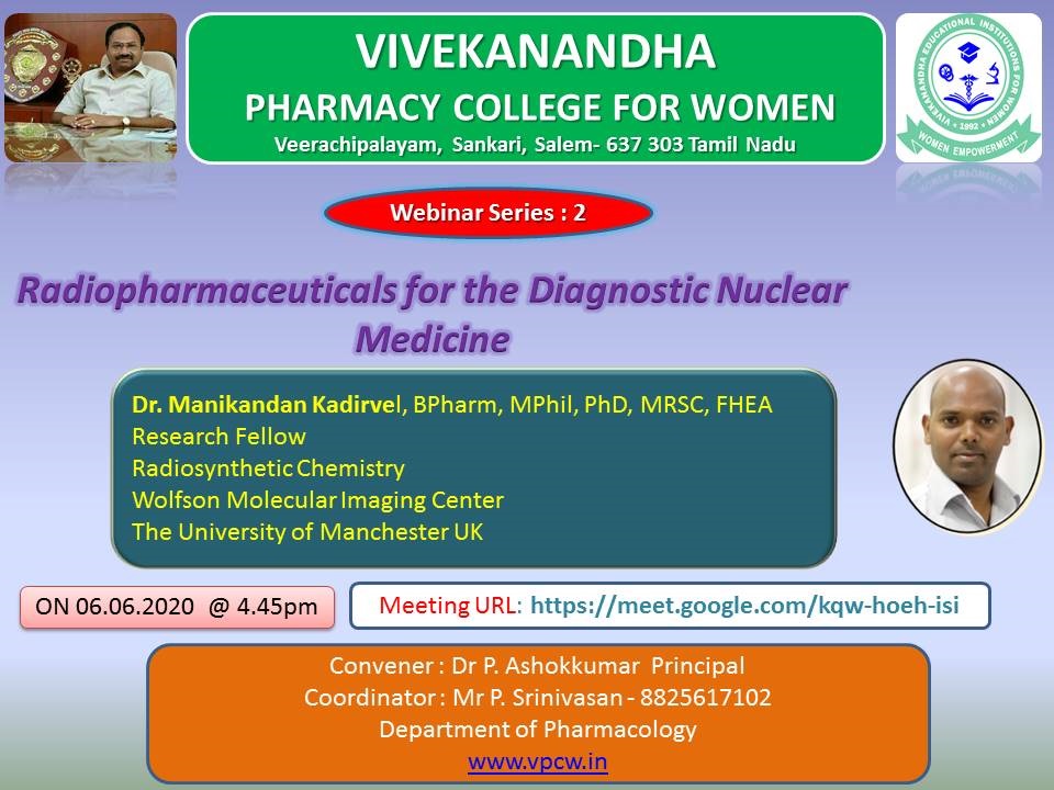 | 2 | Radiopharmaceuticals for the diagnostic nuclear medicine | 06/06/2020 | Dr.MANIKANDAN KADHIRVEL, Bpharm, Mphil, PhD, MRSC, FHEA Research Fellow Radiosynthetic chemistryWolfson Molecular Imaging Center The University of Manchester, UK |