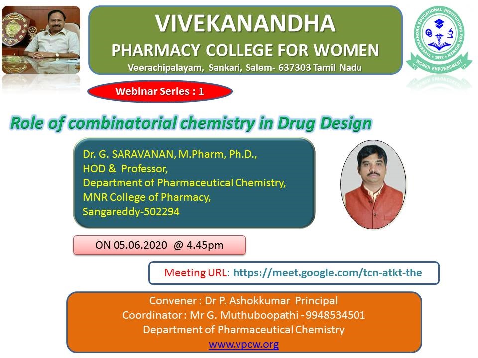 | 1 | Role of combinatorial chemistry in drug design. | 05/06/2020 | Dr.G.SARAVANAN, Mpharm, Ph.D., HOD & Professor Department of pharmaceutical chemistry, MNR College of pharmacy |