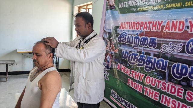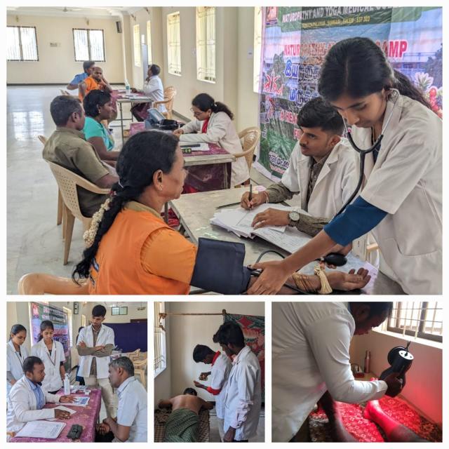 Day 2 Free Naturopathy and Yoga Medical Camp conducted by Swamy Vivekanandha Naturopathy and Yoga Medical College and Hospital Sankari,Salem at Sanga velli vizha kattidam, Sankari on 5.3.23.Around 50 beneficiaries took Free Consultations,Diet Counseling Yoga therapy, Acupuncture and other Naturopathy treatments