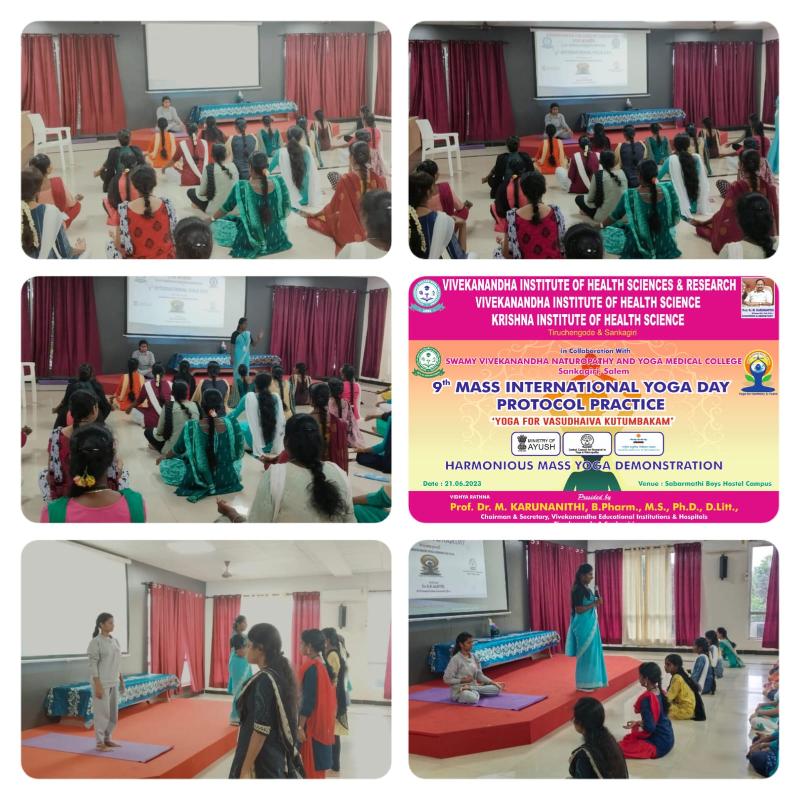 Swamy Vivekanandha Naturopathy & Yoga Medical College, Sankagiri, Salem celebrated International Yoga day 2023 by conducting Mass Yoga Protocol practice session for the students and Faculties of Vivekanandha Institute of Health & Science & Krishna Institute of Health & Science, Elaiyampalayam, Tiruchengode.