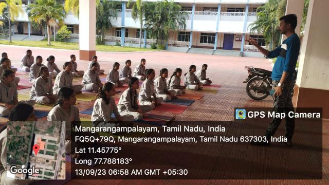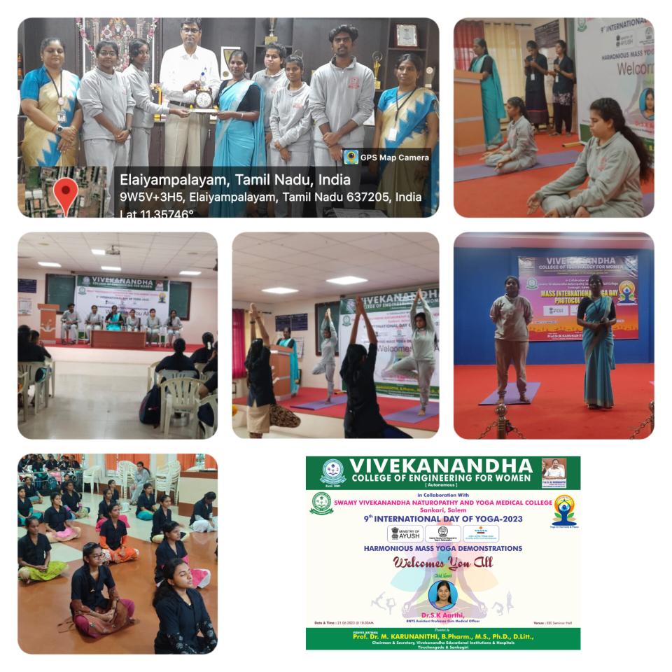 Swamy Vivekanandha Naturopathy & Yoga Medical College, Sankagiri, Salem celebrated International Yoga day 2023 by conducting Mass Yoga Protocol practice session for the students and Faculties of Vivekanandha College of Engineering for Women, Elaiyampalayam, Tiruchengode.
