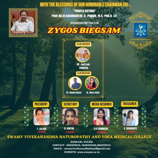 Swamy Vivekanandha Naturopathy and Yoga Medical College Students have initiated a yoga club as ZYGOS BIEGSAM