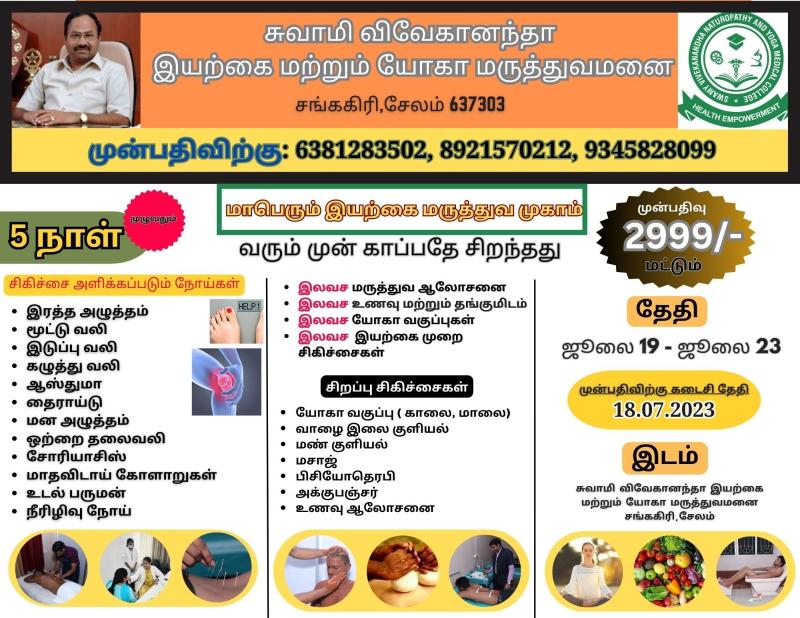 A Mega Naturopathy Medical Camp is scheduled to be conducted by Swamy Vivekanandha Naturopathy and Yoga Medical College for 5 Days in Our SVNYMC Hospital, Sankagiri, Salem