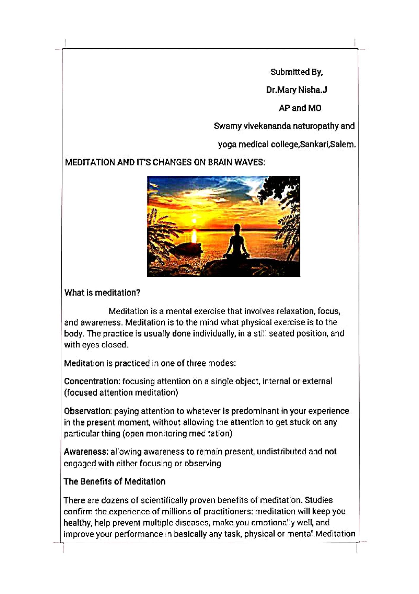 Article about Meditation and its changes on Brain Waves - Dr.Mary Nisha.J, Assistant professor cum Medical Officer, Swamy Vivekanandha Naturopathy and Yoga Medical College, Sankari, Salem.