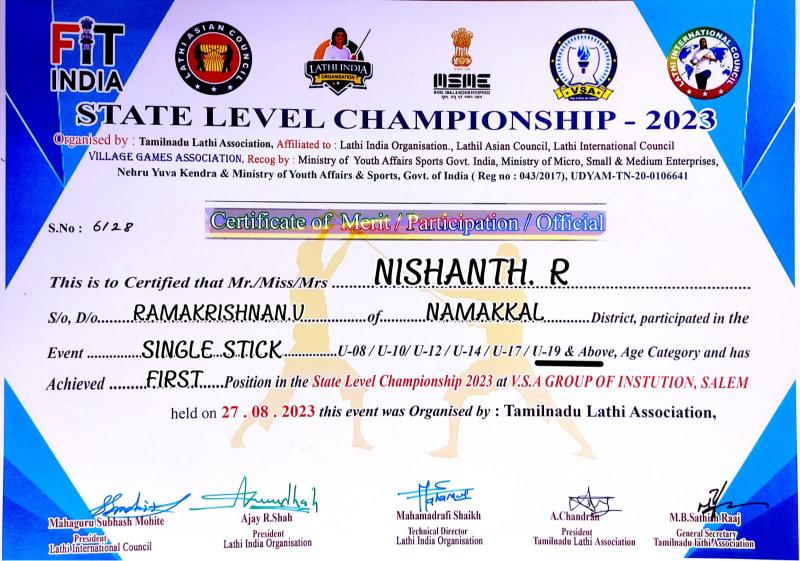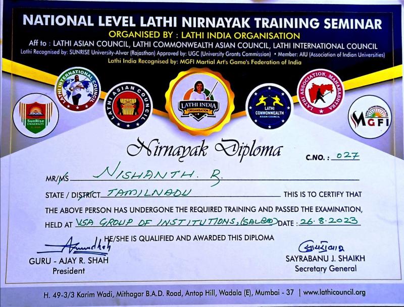 Congratulations to our student Nishanth.R. for securing FIRST PLACE in Silambam at the State level competition in the above 18 years category organized by Tamil Nadu Lathi Association at VSA group of institutions among around 70 participants. He also graduated as National level judge in Silambam.