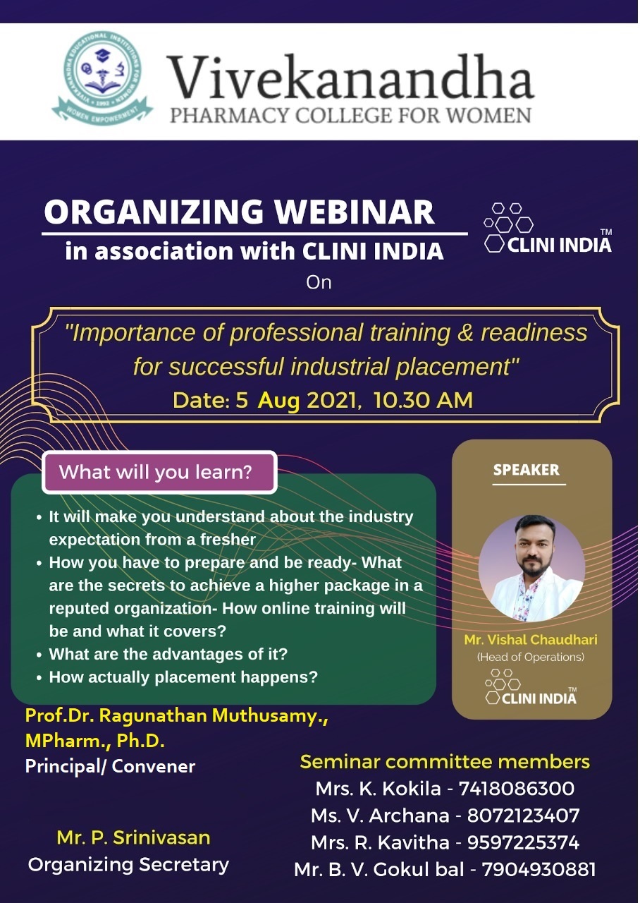 | 8 | Importance of professional training and readiness for successful industrial placement. | 05/08/2021 | Mr.VISHAL CHAUDHARI Head of Operations CLINI INDIA |