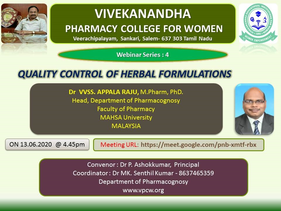 | 4 | Quality control of herbal formulations | 13/06/2020 | Dr VVSS. APPALA RAJU, Mpharm, Ph.D., Head, Department of Pharmacognosy Faculty of pharmacy MAHSA University Malaysia |