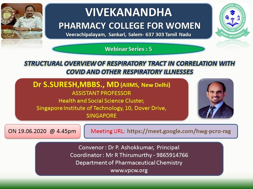 | 5 | Structural overview of respiratory tract in correlation with covid and other respiratory illness | 19/06/2020 | Dr S.SURESH, MBBS., MD(AIIMS, New Delhi) Assistant professor Health and social science cluster, Singapore institute of Technology, 10, Dover drive, Singapore |